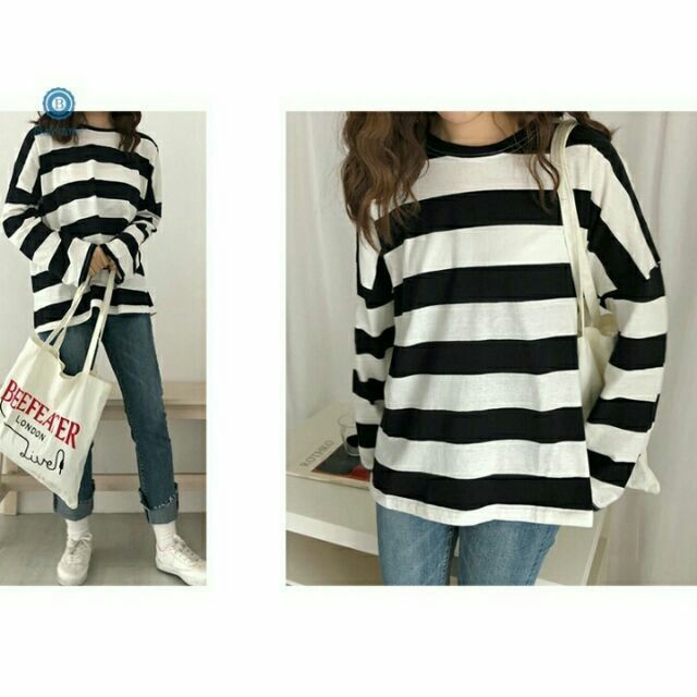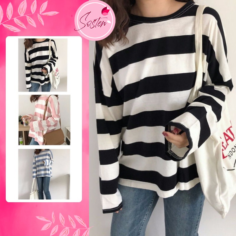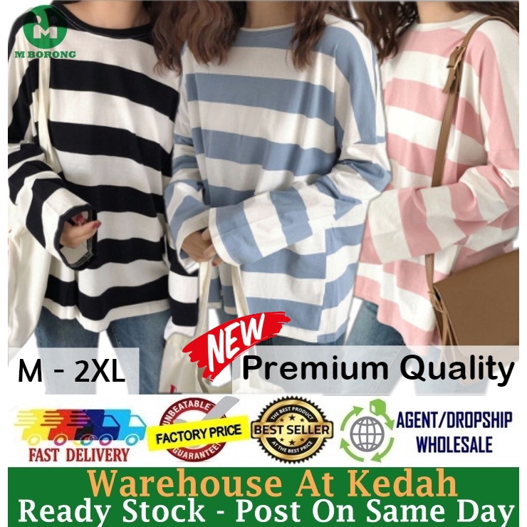 Ready Stock St210 Korean Fashion Plus Size Striped Shirt Fashion Casual Loose Tops Long Sleeve T Shirt Lengan Panjang Shopee Malaysia